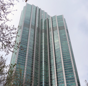 The Canada Trust Tower is part of the BCE Complex, which has 2 office towers and the Allen Lambert Galleria, an award-winning, 6 storey pedestrian avenue conceived by world renowned architect Santiago Calatrava. The Galleria houses Toronto's oldest surviving stone building, the former Commercial Bank of Midland. The shorter office tower has the "joined twin" look while the taller tower has a symmetrical setback design with a spire. The tower also has column-free office floors. |
